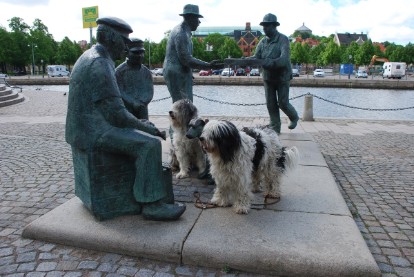 Wir kamen nicht umhin unsere Hunde zwischen die Figuren vor der Fischmarkthalle Feskekörba zu platzieren.